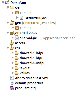 You can then enter some details for the new project. Enter “DemoApp” as the project name, select “Android 2.3.3” from the “Build Target” list, enter “DemoApp” as the application name, and enter “com.ez” as the package name. Make sure that the checkbox “Create Activity” is marked (an activity is the application’s presentation layer), enter “DemoApp” in the adjacent field, and enter “10” as the minimum SDK version. Finally, click the “Finish” button.