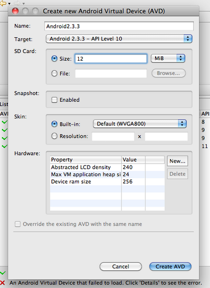 Enter a name for your device, and choose an SDK target and screen resolution. Set the SD Card size to 12MiB (this is just to specify a card size for the Android emulator).