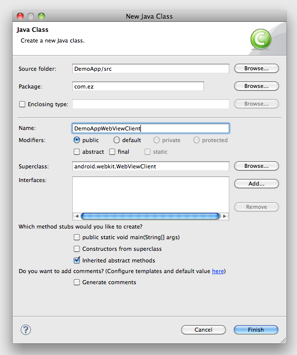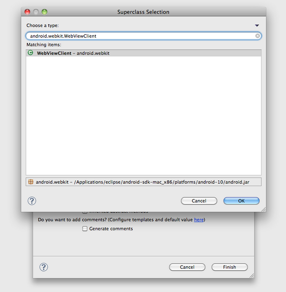 Next, click the “Browse” button to the right of the “Superclass” field. In the resulting dialog, type “android.webkit.WebViewClient”, then click OK. To complete the new class creation, click the “Finish” button.