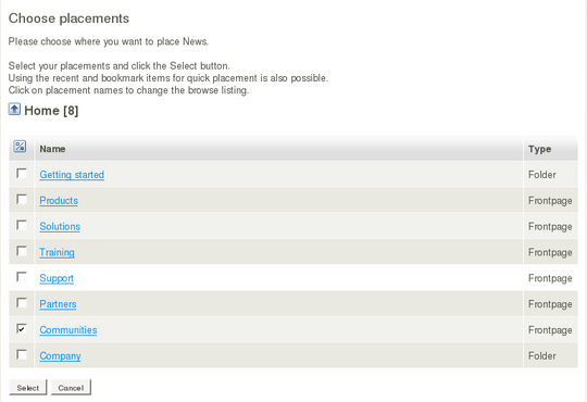 After clicking the button, the top level of your content hierarchy is displayed. As detailed previously for the Administration Interface, navigate by clicking on the listed content names until you get to the location where you want to publish the content. To navigate upwards in the node tree, click the arrow in the top left corner of that window. When you have found the new location, check the corresponding box and click the Select button: