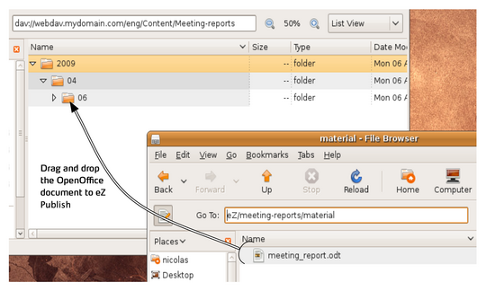Note that the “Open as Web Folder” checkbox must be checked, and that we appended a “#” at the end of the domain name. This is required for Internet Explorer to work properly as WebDAV client. So once you see you content repository in Explorer, you take a simple drag and drop of the files you wanted to attach to the meeting report, as follows (high definition image) :