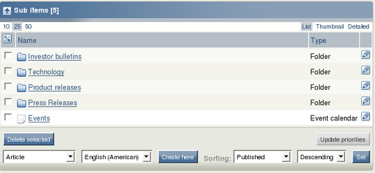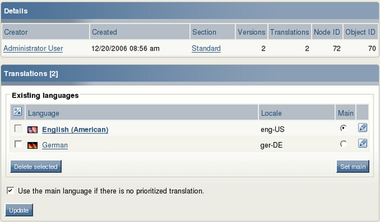 The secondary menu provides access to content and interfaces that are associated with the tab that was selected from the main menu. If your browser has JavaScript support enabled, the secondary menu of the first three tabs is shown as an interactive tree. The main area displays the actual content and interfaces that are associated with the selected node. This is where most of the work is done. When viewing content here, you will see a row of switches at the top that are used for toggling information windows on and off. If all switches are turned on at the same time, the windows will appear in the same order as the placement of the switches (left to right): Preview, Details, Translations (multilingual sites only), Locations and Relations. The Sub items window is always at the bottom.