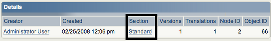 The Details window is shown in the main area of the Administration Interface when viewing some content (and when the corresponding switch has been selected). This displays information about the selected node and the object that it encapsulates: