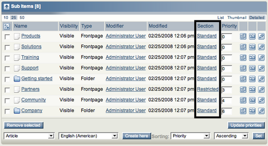The Sub items window is shown at the bottom of the main area of the Administration Interface when viewing some content. When the detailed list type is selected (in the top right of the window), the sixth column shows the section name for each of the children of the object being viewed. Clicking one of the names brings up the Section view interface, as previously described.