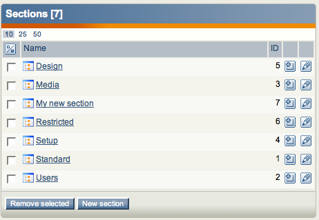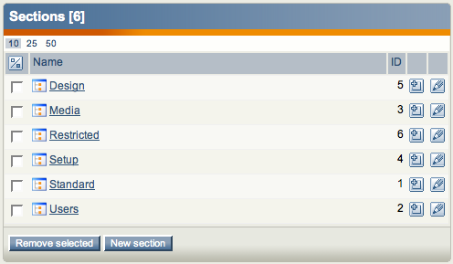 The Sections interface has a header bar showing how many unique sections there are; a main area listing the name and ID of these sections; and a toolbar at the bottom. If you have many sections, you can toggle the number of sections that are listed per page by clicking the numbers "10", "25" and "50" in the top left corner below the header bar. Section management tasks such as creating, editing, assigning and deleting are carried out by using the buttons on the toolbar and the right side of the listing, along with the checkboxes to the left of the section listing.