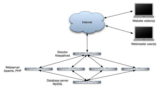 This is the architecture used for clustering Exponential. The architecture is similar to the dual-server environment, but has more webservers and a dedicated server for load balancing.