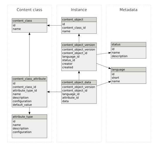As the simplified illustration above shows, the structure is separated into three main parts: content classes, instances and metadata. The developer of an application can use pre-defined classes and create new content classes. Just like a PHP class, each content class has a number of attributes of different datatypes. The actual content is represented as instances of classes and is mapped to the database in a way that facilitates the easy maintenance of different versions, statuses and languages. Both the content class structure and the actual content can be modified at any time without having to change the database structure. A simple “Article” object might have a “Title” attribute of the “string” datatype, as well as a “Body” attribute of the “XML block” datatype. Objects for e-commerce have special “Price” attributes, so that a user can purchase, and pay through payment gateways, products that are assigned different taxes and discounts.