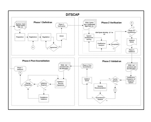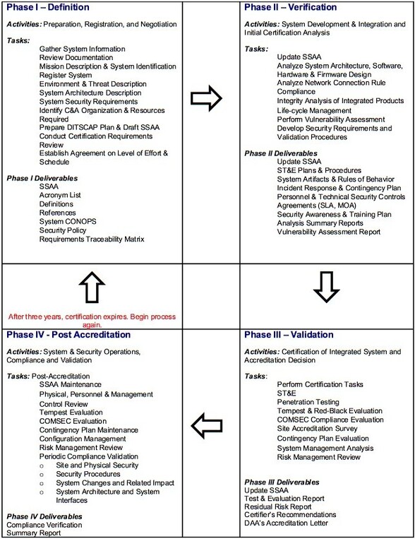 There are four phases to the DITSCAP process: Definition, Verification, Validation and Post-Accreditation. Within each phase, there are a number of activities and associated tasks and deliverables that must be completed and validated prior to advancing to the next phase. See the following diagram for an overview of the phases (click to enlarge).
